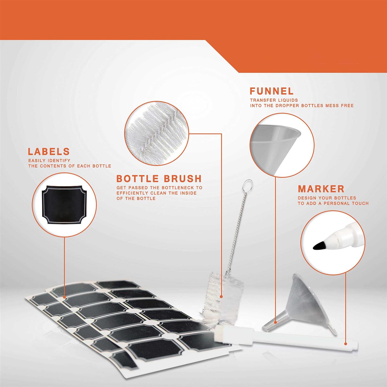 - Set includes 24 glass bottles, 1 funnel, 1 bottle brush, and bonus labels