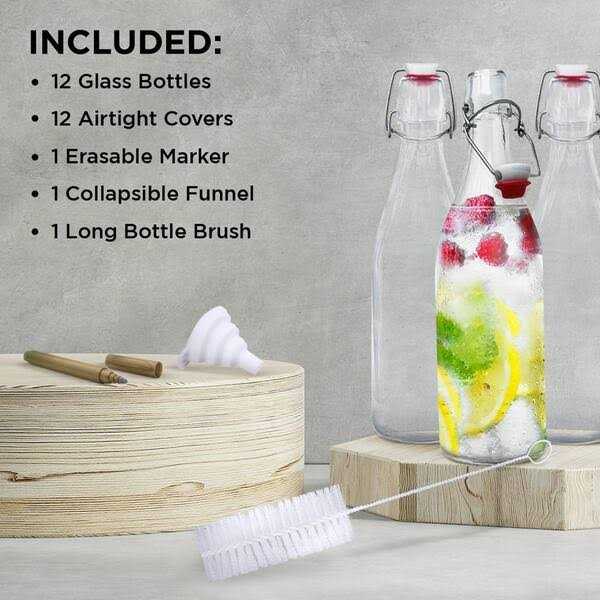 Nevlers 12-Pack 17 oz. Round Glass Bottles with Swing Top Stoppers, Bottle Brush, Funnel, and Gold Glass Marker, Clear