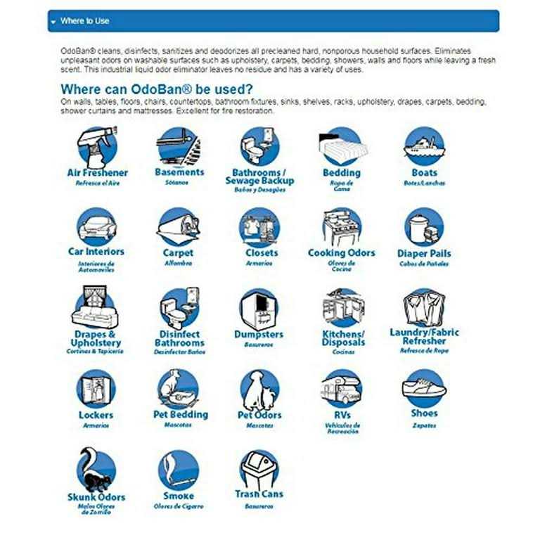 OdoBan Ready-to-Use multi-purpose formula spray does the job of many products in one. It’s an effective cleaner and sanitizer that leaves no residue, and works effortlessly to disinfect hard, nonporous household surfaces. It’s also an effective eliminator of harsh aromas and stenches including pet urine aftermath in carpet, upholstery, and more. It can even stand up to the smell of smoke and can be used in sinks, tubs, and for mopping floors and washing walls. Not only is it an exceptional cleaner, but it’s a great air freshener and will remove harsh smells from any room. It’s also a great way to refresh laundry and fabrics. OdoBan products can be used in both households and business facilities of all types including schools and day cares, hospitals, nursing homes, in ambulances, buses, and trains, in airplanes and taxis, in restaurants and cafeterias; pretty much any place where people commune. When used as directed, OdoBan is safe for use on washable surfaces, including sealed natural stone, stainless steel, ceramic, tile, Formica, fiberglass, rubber, vinyl, terrazzo, and plastic. Safe for use on sealed natural stone countertops and surfaces, like granite, quartz, marble, ceramic, and soapstone. Make Life Fresh with OdoBan.
