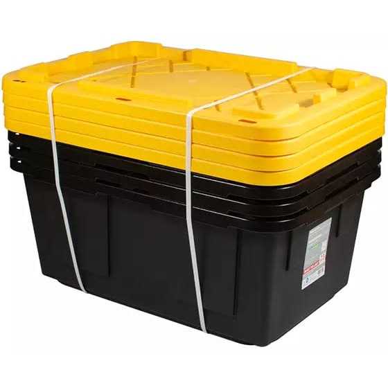 Office Supplies Keep your important items safely stored inside this heavy-duty polypropylene tote. The storage container offers a snap-on lid that helps keep it securely shut, and the built-in handles enable carrying from space to space when needed. Heavy-duty polypropylene for strength. Snap-on lid allows secure closure. 23-gallon capacity is great for a variety of items. Built-in handles enable comfortable carrying. Stackable to save floor space. Conforms to the requirement of NSF/ANS 2 – Food Equipment. Black container with a yellow lid. Includes 4 totes.