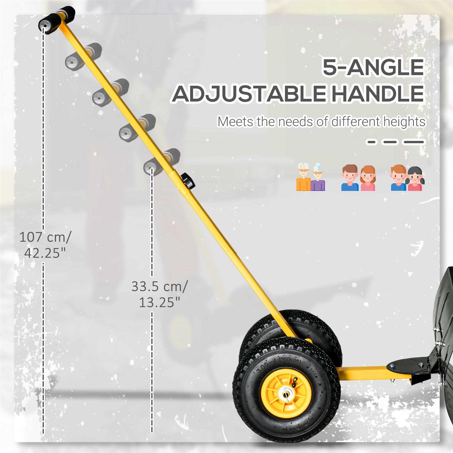 Outsunny has a shovel with wheels so you can push with traction and stop back strain. Stand upright; its handle is padded, and its height can be adjusted for your comfort. This snow pusher also has a wide metal reinforced edge so that you can remove up to five inches of snow in one pass.