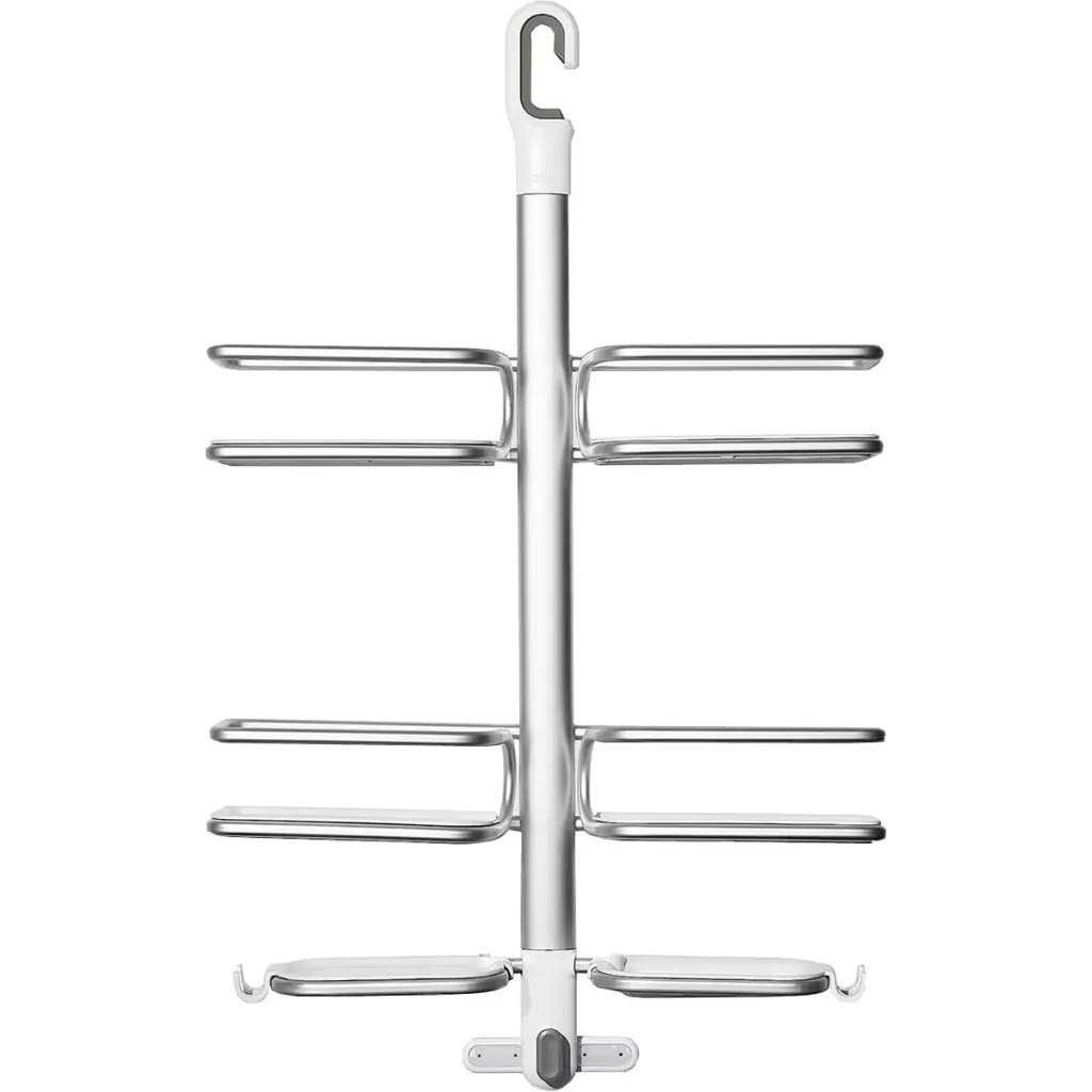 The OXO Good Grips Hose-Keeper Shower Caddy keeps any length shower hose neatly out of the way. This Caddy is effortless to set up, durable and stylish. The Caddy has four large-capacity shelves that accommodate even the largest shampoo and conditioner bottles, two soap dishes and four hooks that make sharing a bathroom a whole lot easier. The trays have drainage slots and holes for storing bottles upside down and are removable for easy cleaning. The StrongHold hook grasps showerhead pipes securely, even at an angle, and the phthalate-free suction cups provide extra stability.