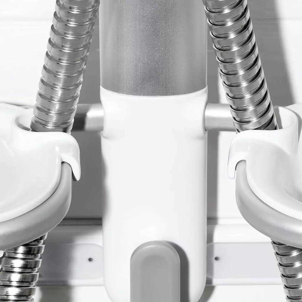 - Hose-keeper design with center opening and built-in notches keeps shower hose out of the way