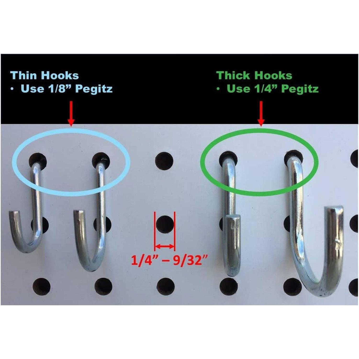 - Easy to use: Simply push the Pegitz part into any standard 1/4″ pegboard hole and then insert the hook or peg.