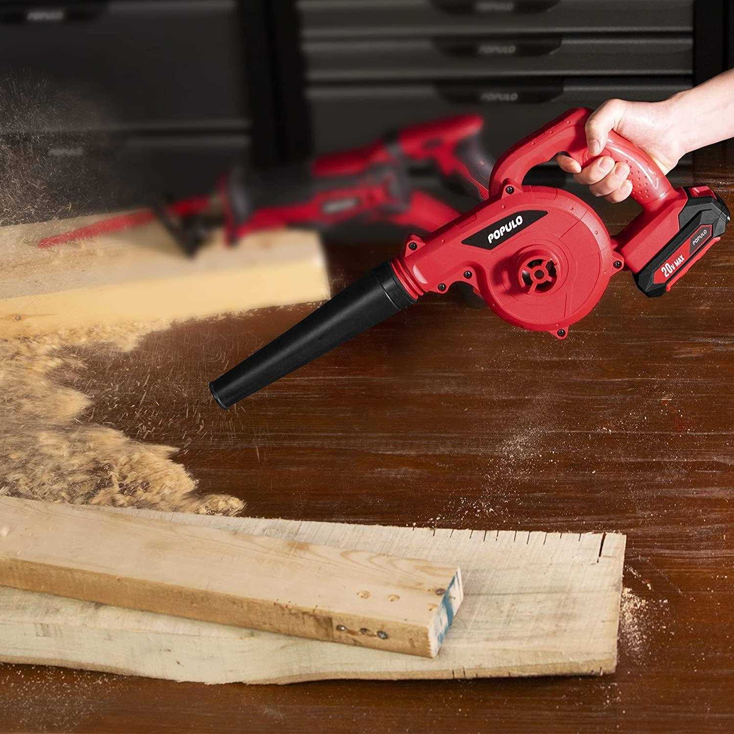 Attention:This blower is suitable for small and simple jobs, not for big areas or heavy jobs. Extra battery pack is available from Amazon. Inflator and Deflator As a bonus, this cordless blower kit has the inflator and deflator attachments included, simply put the attachment onto the air outlet/inlet port to use this blower as an inflator or deflator. Blowing up mattresses or floaties when you are camping or at the bench. It can inflate a standard twin air mattress in less than 60 seconds, making easy work of your air filling jobs. Variable Speed Control Thanks to 20,000/min high speed motor and blower turbofans with large blades provide strong power in its class, delivering air speed of up to 150mph for the removal of dirt and dust. Variable speed by controlling the switch trigger puts even more control in your hands, allowing you to customize the amount of airflow used during cleanup. The battery indicator shows you power consumption all the time and when the battery needs to be recharged. What’s Included This Populo workshop blower kit includes a blower (bare), one blower tube, inflator/deflator attachment, dust collection bag, a 2.0Ah lithium ion rechargeable battery pack and one fast charger. Come with a tool bag for you to conveniently store or carry, get your tools where they need to be when you need them there.