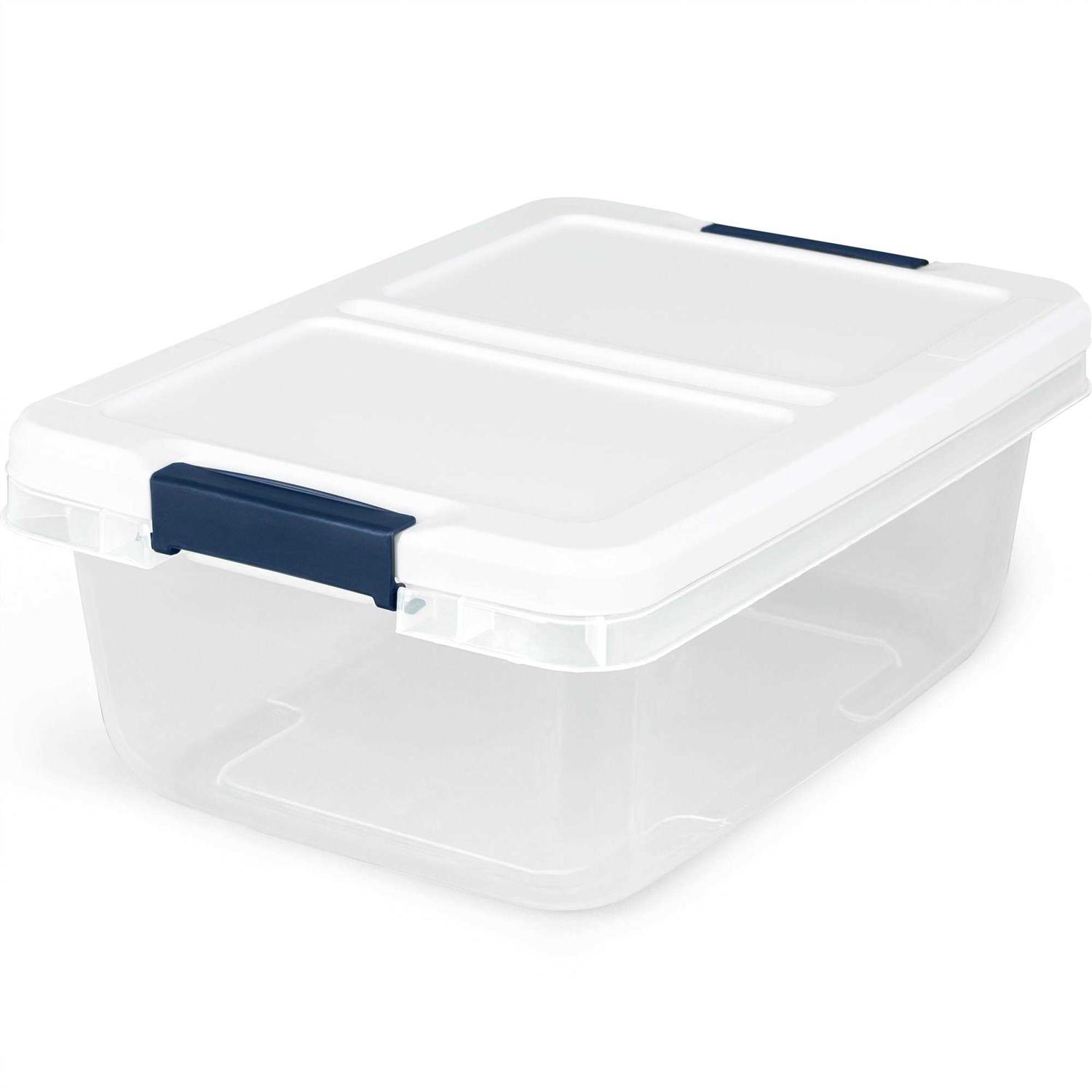 The Project Source 3.75-gallon latching lid tote is one of several other sizes also available to offer numerous stacking combinations, making these totes with lids the perfect storage solution. Features include strong latching handles to keep lids firmly fastened to the base, double-rimmed walls to avoid bowing and buckling, and clear, robust plastic resin to make it simple to identify the items kept inside. Crossbars that are molded into the lids of the plastic containers add an additional layer of strength and durability. These storage bins are ideal for use in offices, workshops, basements, attics, sheds, garages, and anywhere else where you need to stack items efficiently and conserve space.