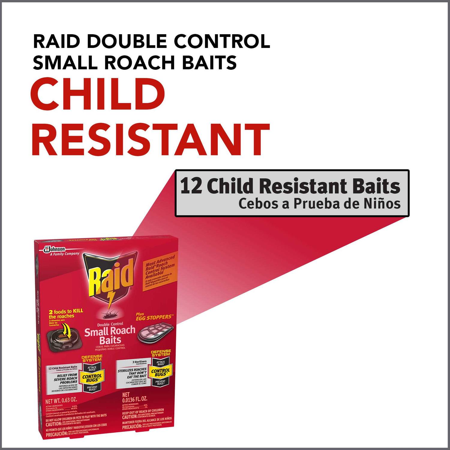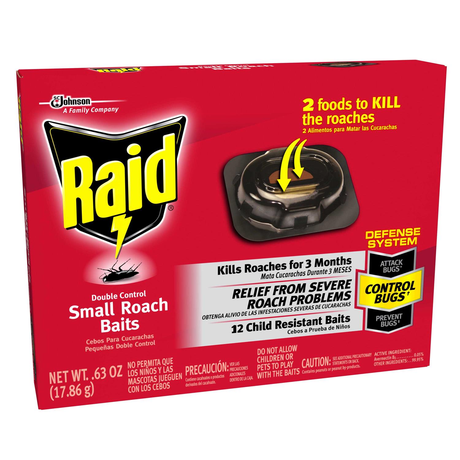Raid Double Control Small Roach Baits kill the roaches you see as well as the ones you dont see with 2 types of baits. After roaches feed on the bait, they return to the nest and transfer the bait to the others, thereby killing the entire nest. Population reduction and less activity can be expected within days, with the baits working for up to 3 months. Kills Roaches, Palmetto Bugs, and Waterbugs.