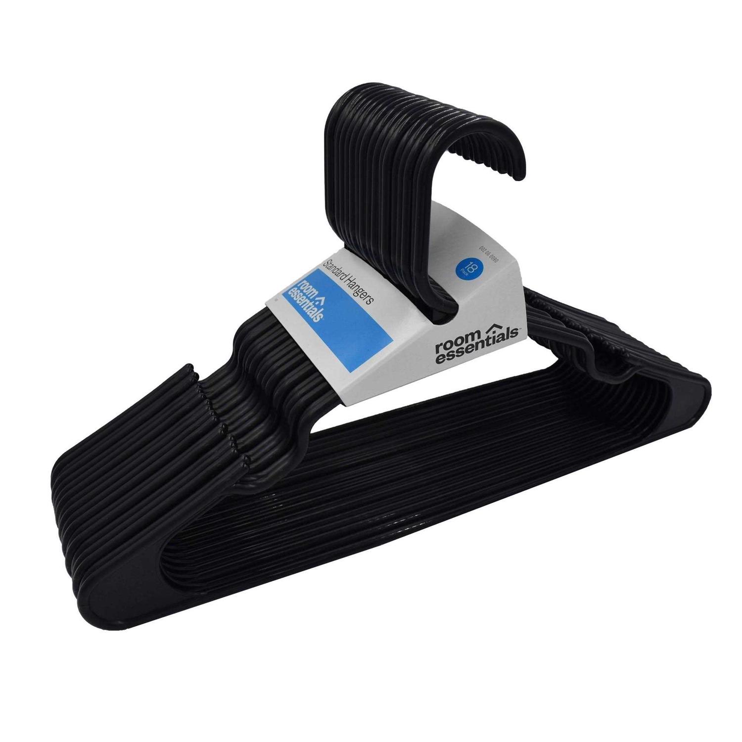 Upgrade your wardrobe with the 18-Pack Hangers. The pack of plastic hangers includes 18 black hangers to efficiently hang coats, shirts, pants and more. Each hanger has perfectly indented notches along the shoulder to allow you to effortlessly hang shirts, blouses or pieces with thin straps, and the horizontal bar is perfect for hanging pants.