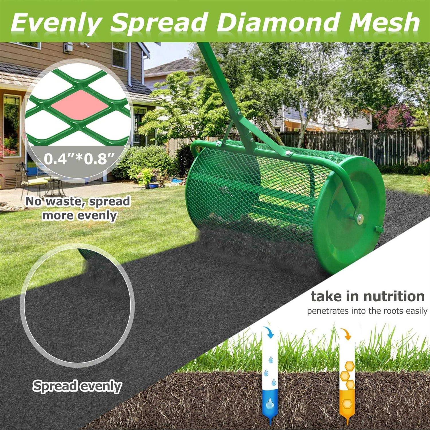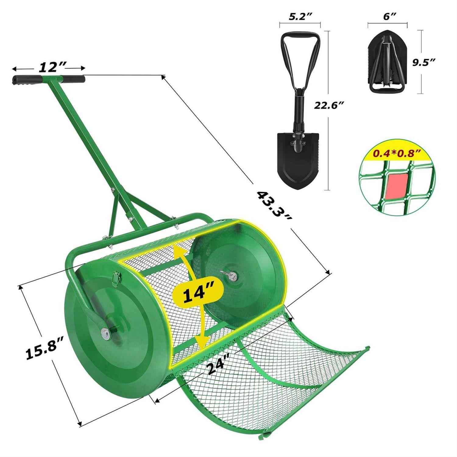 【Premium Material】The Seeutek compost spreader adopts a fully high-quality steel structure, which is sturdy and durable. The roller size is 15.8″ in diameter x 24″ in length, and the metal mesh surface is powder-coated and heat-treated, providing rust and corrosion resistance. Additionally, the ergonomically designed rubber T-shaped handle ensures a non-slip and comfortable grip. 【Upgraded Side latches&Support Rod】Seeutek manure spreader is easy to assemble and quick to disassemble. 14″ Hinged door opens and closes easily for easy filling. Side latches design, which is 6mm snap position and 2mm more than normal snap. The side latch and support rod ensure the roller stays closed during rolling. 【2.8ft³ Large Capacity with Shovel】With a 2.80 cubic foot capacity, topdressing is so efficient that you only need to go back and forth a few times. Spreading more efficiently and faster. It can spread a 1,000 square feet yard in 15 minutes. This prevents you from bending over for extended periods while working. The durable and versatile folding shovel can be used for tasks such as digging, shoveling, sawing, chopping, trenching, and more. It can be folded and stored in the included nylon bag. 【First ChoiceChoice for Beautifying Gardens Lawns】The Seeutek peat moss spreader crush clumps of material during rolling, enabling smooth operation on slopes and uneven terrains. Its 0.4″*0.8″ dense diamond mesh ensures even spreading of compost, peat moss, fertilizers, topsoil, mulch, and other coverings for plants and flowers in lawns, gardens, and backyards. Moreover, it provides essential nutrients for the vegetation, enhancing its growth and beauty.
