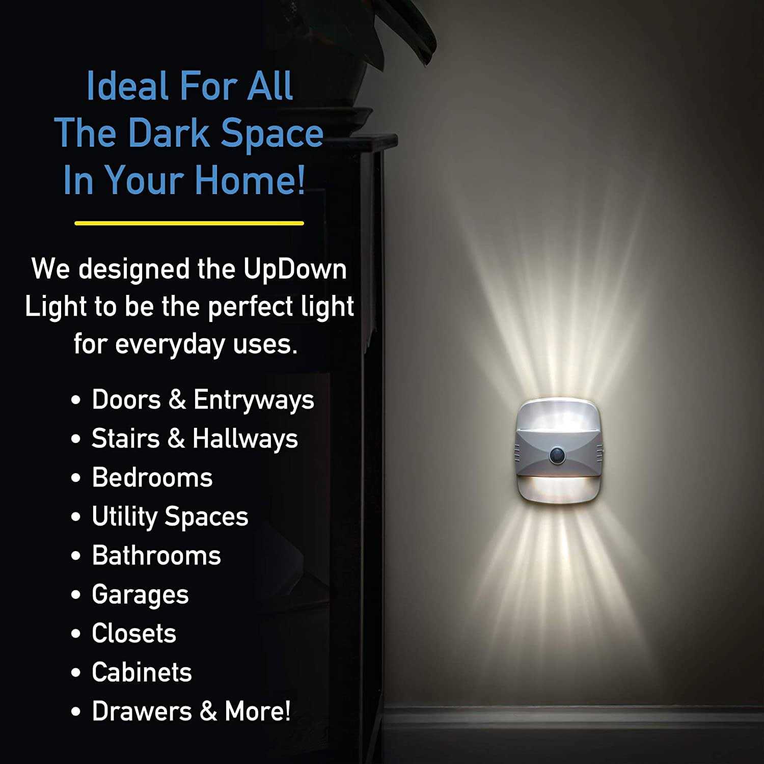 The aptly named UpDown Light gives you three convenient options for casting light: up down or both. Choose up to illuminate tricky areas like keyholes and down for path lighting along hallways – or choose both for the luminosity of 6 ultra-bright LED lights at once! Its advanced motion sensor detects light up to 15 feet away perfect for directing light toward your feet during those late-night scurries from room to room.