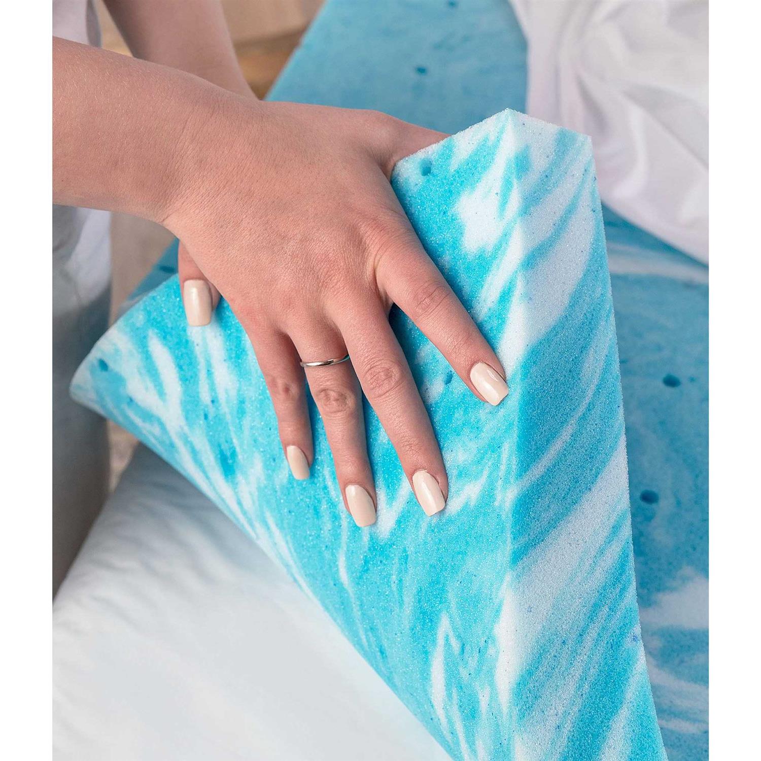 From Sensorpedic, this mattress topper features:swirls of cooling blue gel that transfer heat away from your body, keeping you cool through the night3″ of supportive gel memory foam to absorb pressure and strain while cradling your body’s contours and distributing your body weight for restful sleepTwin approx. 38(L) x 74(W)”Full approx. 52(L) x 74(W)”Queen approx. 59(L) x 79(W)”King approx. 75(L) x 79(W)”California King approx. 72(L) x 84(W)”spot clean5-year manufacturer’s warrantyImported.