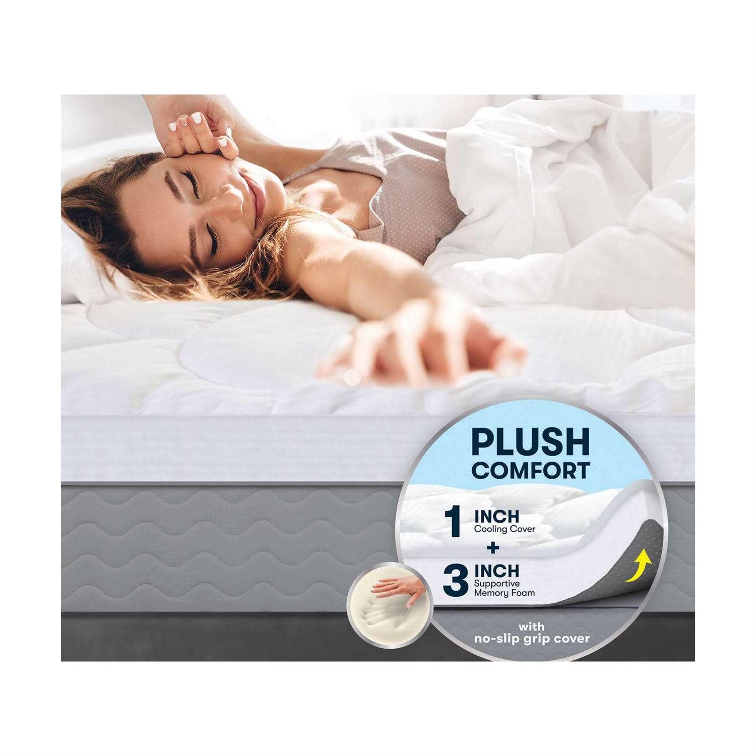 Turn your mattress into a luxurious sleeping surface with a soft pillow-top and cradling memory foam. The 4″ Pillowtop and Memory Foam Mattress Topper features 3-inch layer of memory foam gently supports you while alleviating pressure for soothing sleep. The memory foam layer is topped with one inch of plush pillow-top adding comfort. The included quilted cover with a rubber grip bottom which protects the topper and keeps it in place. The cover is removable and machine washable for easy cleaning. This Serta mattress topper is the perfect way to upgrade a new mattress or extend the life of an old one.