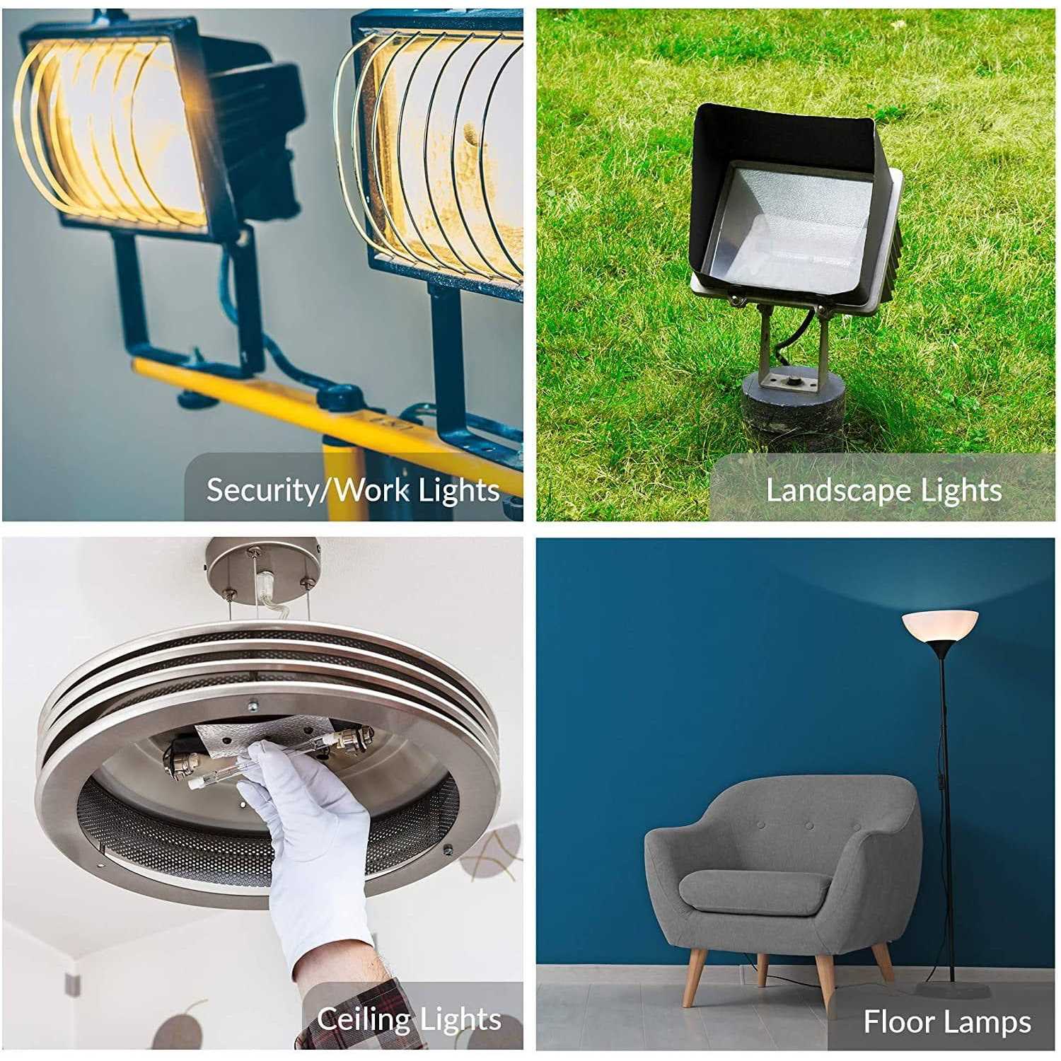 Often used for floodlights, work and security lights, showroom, stage and studio lights, floor lamps, landscape lights, etc. The R7s light bulb has omni-directional 360 beam angle. There is no mercury content and it is instant on. Eco-friendly and Energy Saving: This halogen light bulb takes 100W, giving 800 lumens of light. Assuming an average of 3 hours of daily operation and average cost of 11 per kW, the yearly energy cost is $12.0. High-Performance Quality and Excellent Light Color: The light temperature is 2700K, which gives very nice warm white yellowish color for superb ambiance. The color rendering index (CRI) is 100 comparing to low CRI LEDs so the quality of light is excellent. This halogen light is CE and RoHS certified to ensure high quality. Up to 2,000 hours of lifespan, which is 1.8 years with 3 hours of average daily use. Product Specifications: Power: 100W Luminous Flux: 800 lumens Beam Angle: 360 Light Temperature: 2700K warm white Color Rendering Index (CRI): 100 Voltage: 110V, 120V, 130V Dimmable!