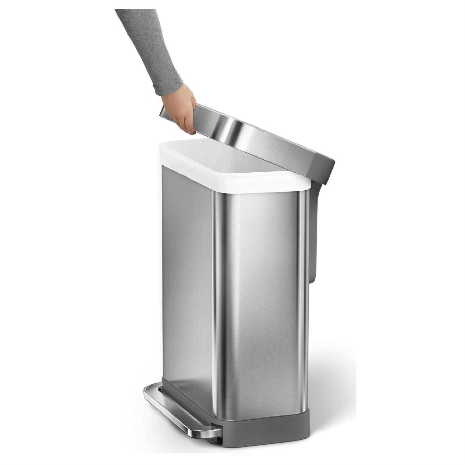 Thanks to its built-in pocket this simplehuman trash can keeps a package of liners at hand so there’s no more rummaging under the sink for a fresh liner. The bucketless design extends capacity and a full-width pedal makes it easy to open the silent lid. A hinged rim conceals the top of the liner. Built-in pocket stows a package of liners and dispenses them one by one. Bucket-free design boosts capacity and simplifies use. White steel and stainless-steel exterior with fingerprint-resistant coating. Internal hinge allows can to sit flush against wall to save space. The lid’s power-assist shox mechanism ensures a slow quiet close. Integrated drip guard minimizes mess. Strong wide steel pedal is engineered to last 150000 steps more than 20 steps a day for 20 years.