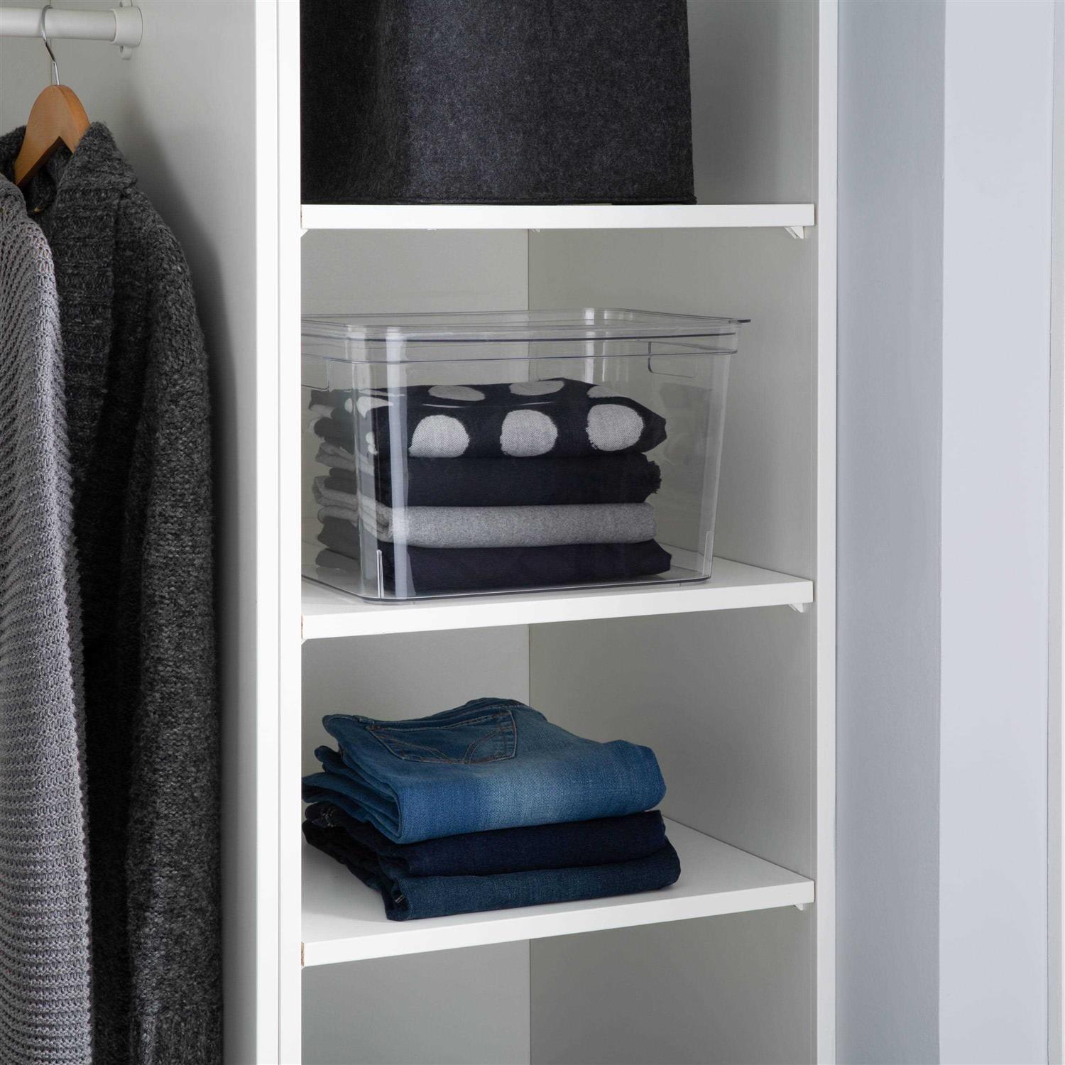 Keep your space organized with the Simplify Large Lidded Storage Bin. It is the perfect size for desk accessories such as notebooks. It is also good for holding towels and washcloths, and it is the perfect size for holding stuffed animals. The stackable design makes it convenient to store items in a sufficient space saving way. The lid protects items from dust and odors and open handles makes the box easy to transport. The clear design makes items inside visible and easy to find. You can keep this transparent storage bin on your desktop or countertop surface because it fits with any room’s décor. You need this bin to help you organize your home!
