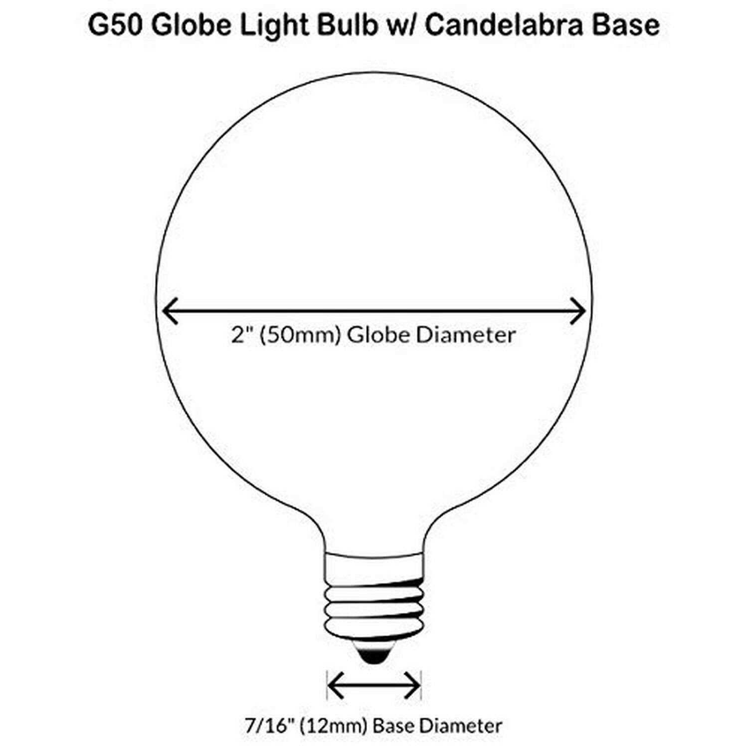 Incandescent Bulbs by Sival. Details:This globe-shaped light bulb has a 2″ diameter, candelabra (E12) base, and 7 Watts. This is ideal for use in indoor and outdoor string lighting with C7 (candelabra) base sockets. PLEASE NOTE: the screw base has a 7/16″ diameter (12mm). Please make sure this is the CORRECT SIZE before you order. Sometimes referred to as G16 or G16.