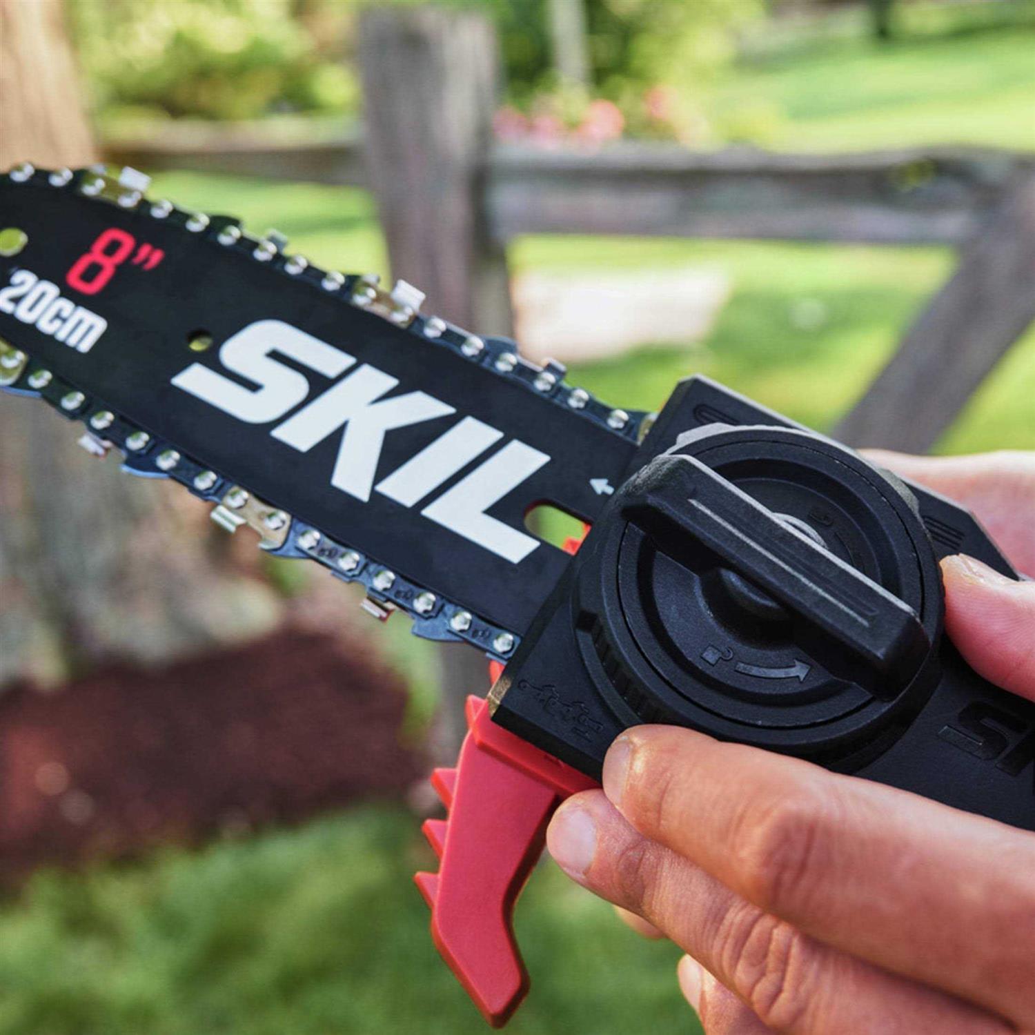 Get dependable performance with a cordless pole saw powered by SKIL PWRCORE 20 Lithium-Ion technology. The saw comes equipped an 8 in. bar and chain pivoting head, along with a 3.5 ft. extendable aluminum shaft, transforming the stock 6.5 ft. pole saw to 10 ft. with ease. Additionally, this saw comes equipped with a 135 Degree pivoting head and 8 presets, providing greater control and convenience for tough to reach branches. The pole saw features an auto-lubricating chain for reduced friction and enhanced durability, while tool-less chain tensioning allows for hassle-free adjustments on the job. This pole saw kit includes a PWRCORE 20 2 Ah 20V Battery and Charger, plus an Easy Storage Bracket to conveniently store all your SKIL PWRCORE 20 outdoor equipment with ease.
