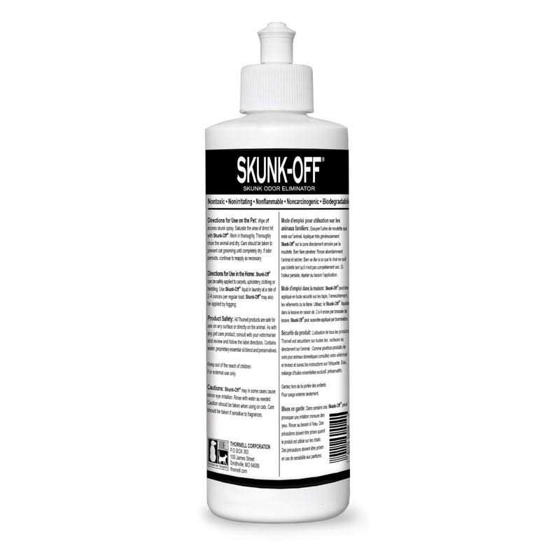 Liquid odor remover removes skunk odor from dogs, other pets, and fabrics Apply full-strength;works in minutes and eliminates odor permanently For best results with pets, bathe with a skunk shampoo, apply, and allow pet to air dry Skunk Off Odor Remover will neutralize odor as it dries Available in 8-ounce size Size : 8-Ounce Removes skunk odor from dogs, other pets, and fabrics. Apply full-strength. Works in minutes and eliminates odor permanently. For best results with pets, bathe with a skunk shampoo, apply, and allow pet to air dry. Skunk Off Odor Remover will neutralize odor as it dries. Skunk Off comes in a 8-ounce squeeze bottle. Stops skunk odor fast-Permanently on dogs, you, your clothers, cats, home, car anything. It is safe nontoxic and nonirritating. Measures 7-inch length by 2-inch width by 2-inch height.
