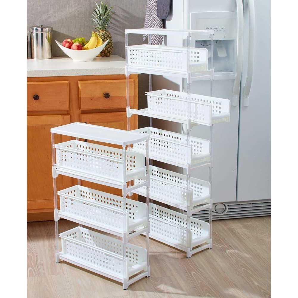 This Slim Sliding Drawer Storage unit is a simple organizational solution for small spaces. Each removable drawer slides out for easy access to the items inside. It’s ideal for holding smaller items in the bathroom or pantry.5-Tier, 7-1/8″W x 18-3/8″D x 44-1/4″H. Polypropylene, plastic and polystyrene. Easy, no-tool assembly required. Compact design fits into most small areas Each sliding drawer is also removable Details:5-Tier, 7-1/8″W x 18-3/8″D x 44-1/4″HPolypropylene, plastic and polystyrene.