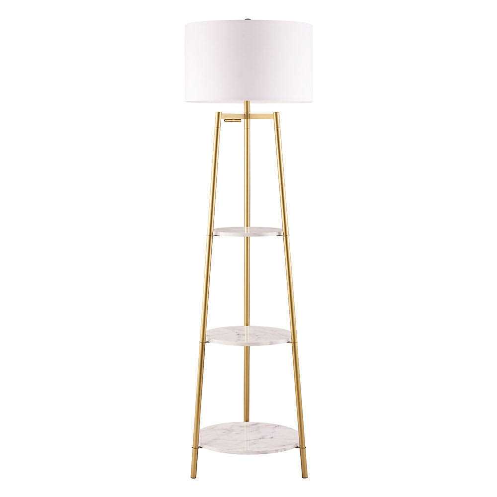This floor lamp has 3 shelves for storage/display it is a great solution for a nightstand with limited room. It is able to display books glasses cup on it for function and light is bright enough.
