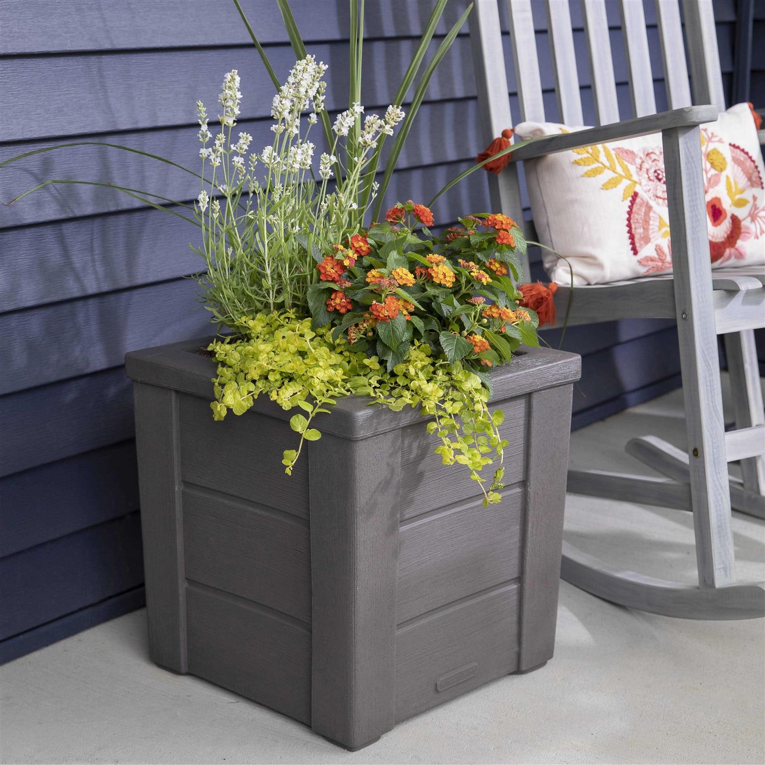 Step2 This season, update your home’s appearance with fresh plants in a beautiful Step2 planter on your porch, walkway, patio, or yard. Thoughtfully designed by Step 2, the natural wood look of the Lakewood Planter Box will complement the beauty of your plants and flowers for years to come. The self-watering, sub-irrigation feature encourages healthy root growth and allows plants to maintain moisture in their absence. Featuring our signature high-quality construction, your planter box will maintain its structure and dark cedar colouring with little to no maintenance required. The authentic wood look creates an attractive, low-maintenance planter box ideal for enhancing almost any landscape or patio space.