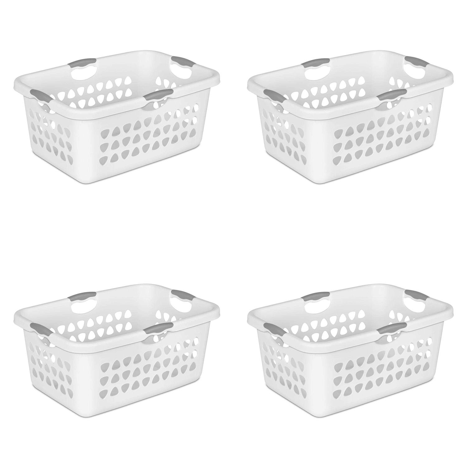 The Sterilite 2 Bushel Ultra Laundry Basket is designed with a wide rectangular opening that is suitable for holding large loads of laundry. The basket offers durable construction with a reinforced rim that makes transporting clothes to and from the laundry room easy. This laundry basket is perfect for sorting a household full of clothing towels sheets and more. Its sturdy rim provides added strength and its 4 handles offer a comfortable carrying grip making it easy to carry from any angle. The round hole pattern increases air flow for added ventilation which helps eliminate excessive and unwanted odors. The overall dimensions of this item are 26 3/4″ L x 18 3/4″ W x 12 1/4″ H.
