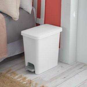 Sterilite’s 2.7 Gallon / 10.2 Liter Rectangular StepOn Wastebasket features a color accented pedal, that when lightly pushed by a foot, smoothly opens the lid. Nested inside of the base is a removable liner that accommodates a standard-sized plastic shopping bag or a 4 gallon trash bag. The liner offers a bag-holding feature that keeps the liner from sliding out of place, as well as hidden from view when the lid is closed. Simply push the edges of the bag through the holes in the sides of the liner, securing the bag in place. This wastebaskets modern, space efficient design makes it the perfect solution for smaller spaces in the bathroom or office. It’s sturdy construction and easy to clean textured plastic make it an ideal solution for busy households. The overall assembled dimensions of this item are 12 1/8″ L x 7 7/8″ W x 12 7/8″ H.