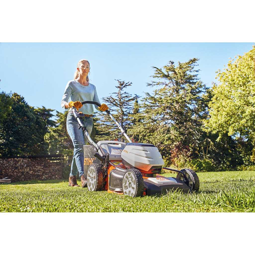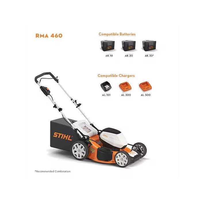 The STIHL RMA 460 is the first lawn mower in the AK Series, giving AK battery users a full line of products to complete tasks around their lawn. This lawn mower is compatible with the AK20 or AK30 battery, providing homeowners with performance options based on yard size. With a deck width of 19 in, the RMA 460 is highly maneuverable for quick and efficient grass cutting with each pass. Its 15.85 gal grass catcher allows for more grass cutting and less stopping, while the handle bar is easily adjustable for user comfort. The RMA 460 is great for small to medium-sized yards under a half-acre and can also be used as a mulching mower.