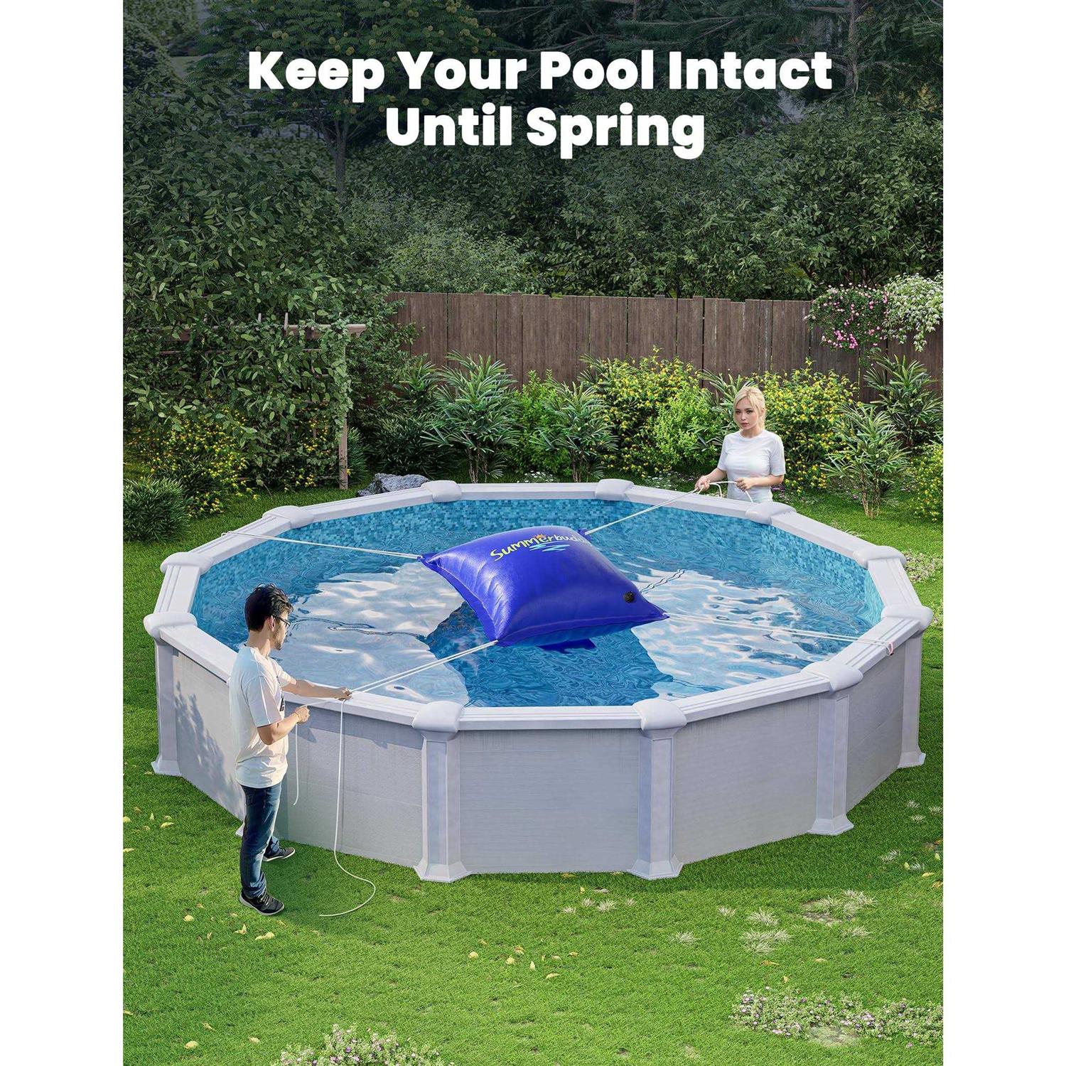 【SUPERIOR PROTECTION】SUMMERBUDDY pool pillows for above ground pools can protect the above ground pool wall and pool cover from pressure caused by ice expansion. As a support for the pool cover, it reduces the build-up of leaves, snow and dust and prevents collapse. Note that you only need to fill the pool pillow to 50-70% of its capacity! 【DUAL VALVE】Unlike other ordinary valves. The dual air valve with threads is extremely airtight and increases the speed of inflation and deflation. The first fold allows air to flow into the pool pillow without losing air. Valve is suitable for most blowers, inflatable pumps 【STAY IN PLACE】 Reinforced grommets at corners to keep the pool air pillow in position at the center of the pool . Just slip the included rope through and tie the pool pillow to your pool. Allow the rope to be slightly loose. 【STRONG & DURABLE】Winter pool pillow is made of strong, durable, 0.4 mm thick cold resistant PVC material. Double sealing technology ensures the pillow can withstand extreme weather. Will not leak, tear or deflate, even at temperatures as low as -13 degrees F (-25 degrees C). 【SAFETY GUARANTEE】 The set includes a 4ft*4ft pool pillow for winterizing, a 50ft rope and instructions. All materials of the product have been tested in accordance with product testing and standardized material specifications to ensure product quality and consumer safety. pool pillow