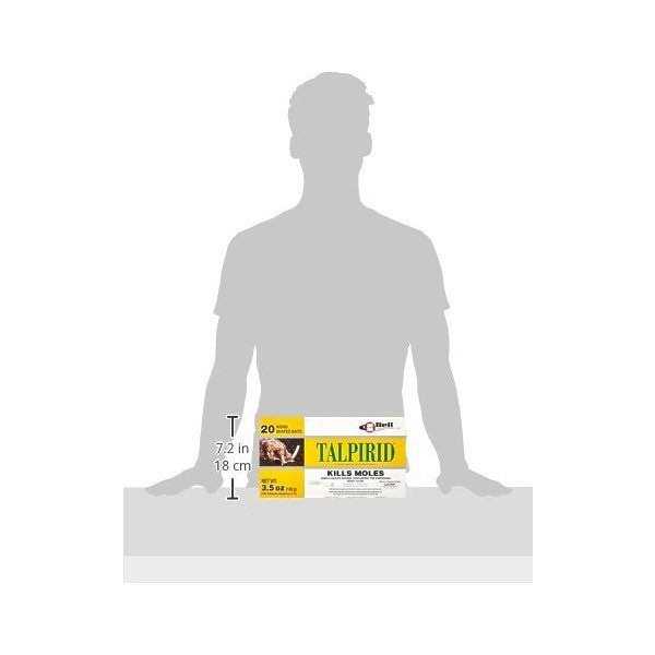 Scientifically Proven to Kill Moles TALPIRID Mole Killer is a worm-shaped mole bait scientifically proven to kill moles in lawns and gardens. Moles usually die in their tunnels, often within 12-24 hours of ingesting the TALPIRID bait. Developed and tested on live, captured moles, TALPIRID Mole Killer works where grain baits, repellents and a myriad of home remedies have failed. This revolutionary mole bait mimics the mole’s natural food – the earthworm. Plus it contains special enhancers that attract moles. Each box contains 20 worm shaped mole baits, which is typically enough for 2 treatments. It is highly recommended that you use gloves when placing the baits so that your human scent is not transferred to the bait.