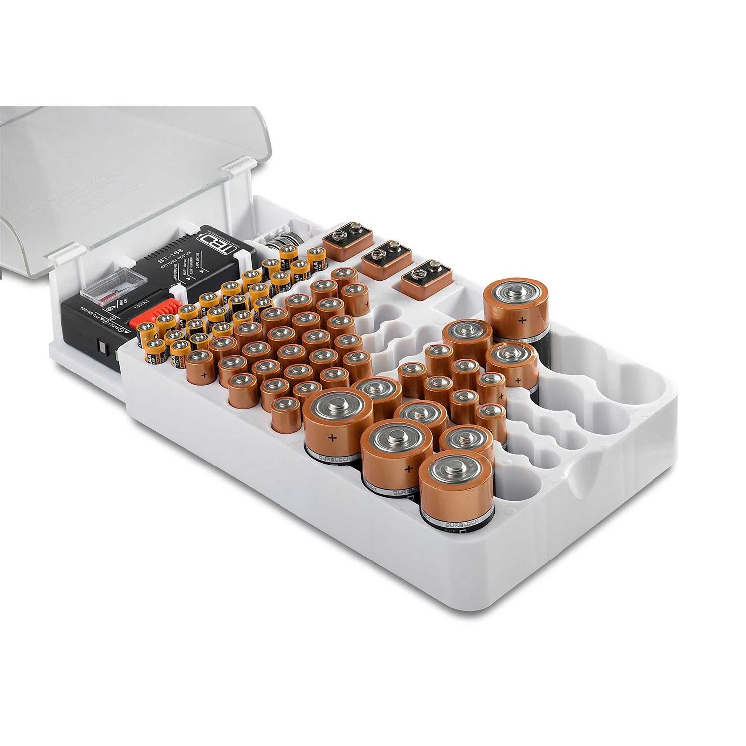 Great item to eliminate your cluttered drawers and closets. Helps keep your batteries neat and organized also includes a battery tester that you can easily remove. The tester doesn’t require any batteries for operation. It works on the power of the battery you are testing you can store it conveniently in your drawer, closet or you can mount it on the wall. Stores up to 93 batteries in various sizes including 45 aa, 25 aaa, 4 9 volt, 8 c, 6 d and a swing drawer for 5 flat batteries.