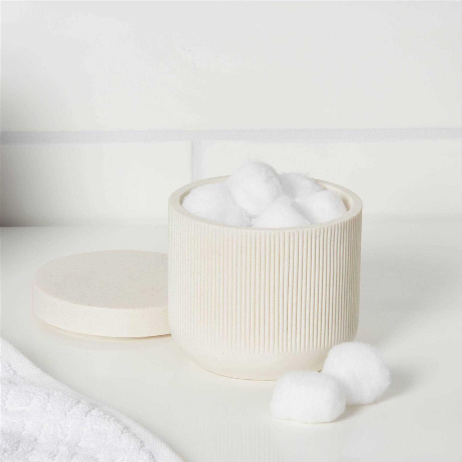 Maintain a tidy bathroom in style with this Sand Modern Resin Canister from Threshold?. It showcases a cream color with a ribbed finish to bring a touch of modern texture and style. The practical canister is great for storing cotton balls, swabs, makeup accessories and other small essentials. It comes with a top lid that keeps contents secure and dust-free. You can pair with similar items from the same collection to complete your coordinated bathroom set.