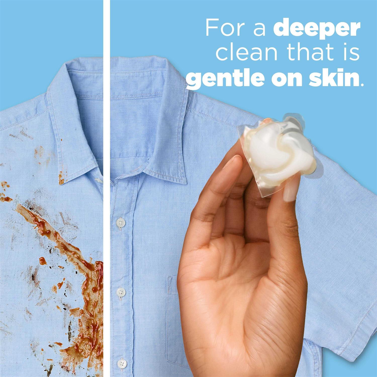 Face it, the world can be a really dirty place. Coffee mugs get jostled, flowerbeds get weeded, and home plates get slidden into. In a world where common stains can be mere moments away, you need a clean that can stand up to them. Tide Power PODS Free & Gentle is here with the cleaning power you want, free of dyes and perfumes, and is specially formulated for those with sensitive skin. By combining concentrated detergents, powerful stain removers, and color protectors into one convenient laundry pac, Tide 3-in-1 Power PODS Free & Gentle gives you the clean you need with the convenience of drop-in-and-done. All without the dyes and perfumes you’re trying to avoid. But the news gets even better. Tide 3-in-1 Power PODS Free & Gentle works in any machine, even if you don’t normally use an HE detergent, and is designed to dissolve even in cold water. Just place it in the washing machine drum before clothing and you’re good to go. That’s not only good for your sense of clean, its also good for your energy bill. Which means it’s also good for your planet, and your wallet. Get the clean of Tide with the convenience and confidence of Power PODS in every load, every time, for every family, in any kind of water, free of dyes and perfumes. Works on 100% of common stains, even in cold water. A 3-in-1 clean, with concentrated detergent, stain removers, and color protectors. America’s #1 trusted detergent. **Consumers’ #1 Trusted laundry detergent brand in Reader’s Digest survey No added dyes or perfumes.