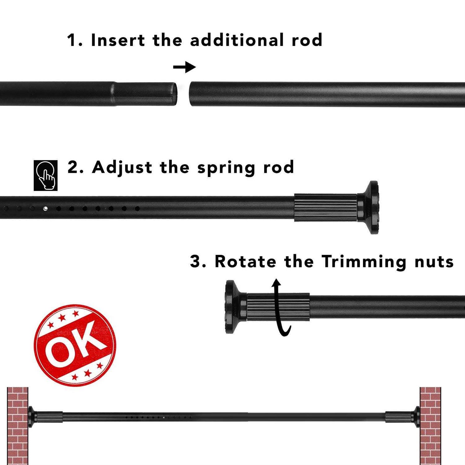 【Easy to Install】The adjustable shower curtain rod is available from 51 to 145 Inches. It only needs to adjust the length through the adjustment button,so you can quickly and easily install the tension rod without drilling, screws or any tools. 【Never Rust & Constant Tension】Shower curtain rod offers rust and corrosion resistance . In addition,there’s no slipping with this tension rod and it’s gentle on walls. It offers a long-lasting, sturdy hold and a max load of up to 66 lbs. It is recommended that the spring rod not be pulled to its maximum length, and that light to medium weight curtains should be used. 【Apply For All Surface】This tension rod can be applied on all surfaces include both of smooth and rough surface like wallpaper, paint wall, tile wall, wooden frame, Etc. Rubber plate will not scratch or damage the installation surface. 【Multi Purpose】The shower tension rod can used in other areas of the home,such as bathroom,bedroom ,kitchen,balcony.Use it to hang privacy curtains in a doorway or blackout curtains in a bedroom window. 【Included Product Accessories】One spring rod, one additional long rod(about 42.5 inches), two additional short rods(about 23 inches), two trimming nuts and two end caps. The diameter of the rod is about 1.26 inches. The diameter of the end cap is about 2.95 inches.