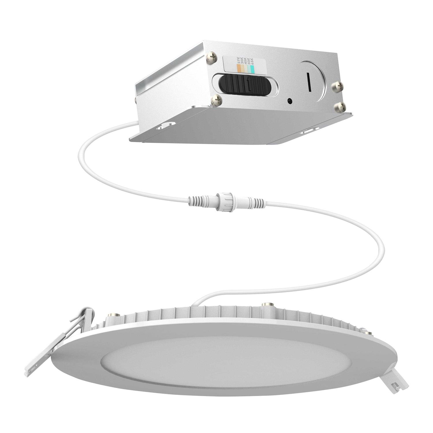 The Flat Panel 6 Inch Color Selectable Extra Bright Canless Recessed Lighting Kit makes it easy to add downlights anywhere you want. No need for an existing recessed can or junction box in the ceiling. Simply cut a hole in the drywall based on the instruction sheet dimension stated, run your Romex cable from the direct line voltage to our can less retrofit kit thru the knockout to the quick connect terminal, daisy chain additional Romex from the quick connect thru the knockout to your next can less retrofit kit, then push the spring loaded clips thru your existing hole. The springs will pull up on the retrofit kit for an airtight seal. The load profile design makes it the perfect option for low plenum clearance for indoor and outdoor residential, hospitality, commercial and multifamily applications with confined, hard-to-reach spaces such as closets, attics, bathrooms, hallways, stairwells, elevators, soffits, porches, and entryways.