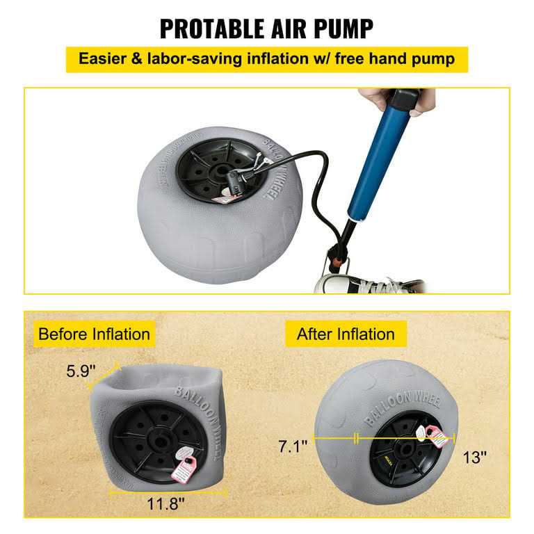 Brand Introduction VEVOR is a leading brand that specializes in equipment and tools. Today, VEVOR has occupied markets of more than 200 countries with 10 million plus global members. Why Choose VEVOR? 1. Tough Quality Assurance 2. Incredibly Low Prices 3. Unlike other ordinary wheels, the sand will not easily infiltrate ours. Wide Compatibility Our beach tires strong hub can fit an axle with a 0.9-inch diameter, so please measure your cart’s axle in advance to make sure the hub suits the axle. TPU Beach Tires Heavy-duty balloon wheels are constructed of TPU material and built to last, supporting gear up to 121 lbs. You can freely load plenty of equipment when gardening, traveling, camping, and fishing. Take your cart anywhere with our wheels. Suitable for Different Terrains Our balloon tires are ideal for transporting loads over rough and uneven ground such as sand, grass lawn, and gravel. Its smooth and light tread pattern makes it more resistant to punctures, designed specifically to roll easily over sand with minimal effort. 2PCS x 13 inch beach wheels are easy to inflate with included air pump and allow for streamlined movement over a variety of terrains. After inflation, the diameter is 13-inch, and the thick tread is 7.1-inch. Various Application These sand wheels can get through the sandy beach and transport a heavy load across any sandy or uneven terrains. It is versatile, making it a perfect companion for beach trips, camping, fishing, and gardening. Specifications Number of Wheel: 2 Wheel Diam. 1: 11.8 in/ 30 cm (Before Inflation) Wheel Diam. 2: 13 in/ 33 cm (After Inflation) Wheel Thickness 1: 5.9 in/ 15 cm (Before Inflation) Wheel Thickness 2: 7.1 in/ 18 cm (After Inflation) Wheel Material: TPU Loading Capacity: 121 lbs/ 55 kg Low Pressure: 2-3 PSI Hub Diam.: 0.9 in/ 22 mm Item Weight: 9.7 lbs/ 4.4 kg Package Content 2 x Beach Wheel 1 x Inflatable Fixture 1 x Air Pump 1 x Instruction