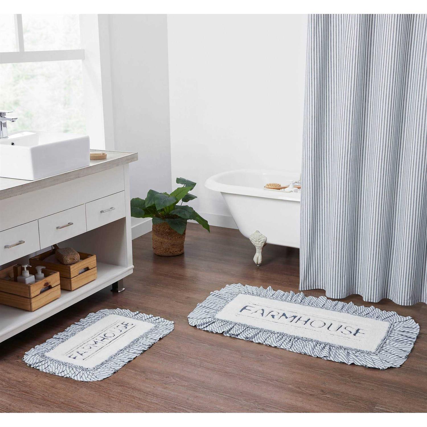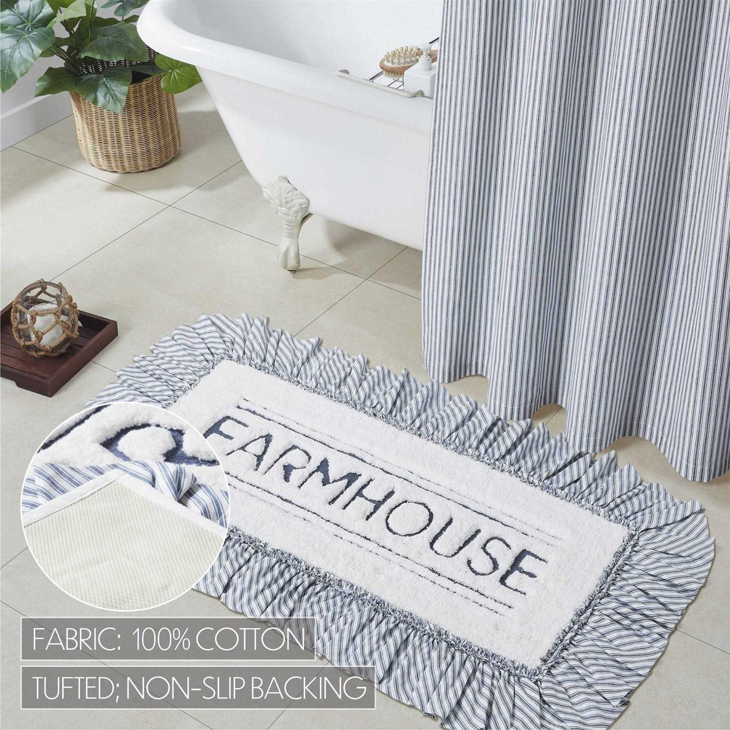 Bathmat Sizes: 20′′ x 30′′ 27′′ x 48′′ Step out of the shower and into a cozy modern farmhouse bliss. A high-quality core provides a thick cushion to sink your feet into and durable cotton to absorb water providing a safe and comfortable post-shower landing. It is trimmed with a ruffled ticking stripe fabric in dusty blue and white. The center of the rug features bold embroidery of “Farmhouse” in a clean and simple font. Backed with textured rubber to produce a quality, non-slip surface without the need for a separate rug pad. This ruffled bath mat is a great finishing piece for bathrooms or laundry rooms where you need the perfect balance of style and functionality. Versatile styling is sure to match country chic, farmhouse, or cottage decor. Perfect addition for the Christmas holiday or year-round. Care Instructions— Machine wash on a delicate cycle and lay flat to dry.