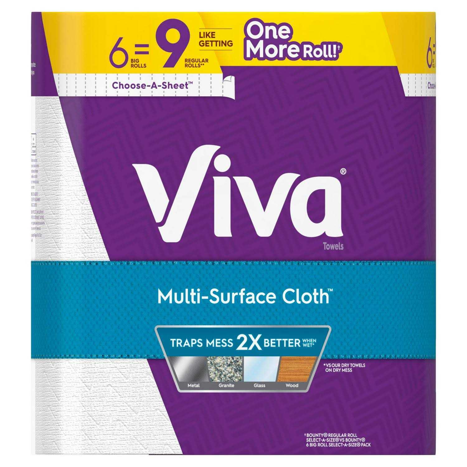 Keep your home or office clean using these Viva Multi-Surface Cloth Paper Towel Rolls. They’re designed to trap messes even when wet. These household paper towels feature Texture-Weave and two sponge-like absorbent layers to help you maintain an exceptional clean every day. They offer cloth-like durability, making them strong, absorbent and versatile for wiping away accidents throughout your home or office. These Viva paper towels can trap and lock messes safely on kitchen countertops, bathroom surfaces and all rooms in between. They can even be used on granite, stainless steel, glass and wood. This package includes six big rolls with 83 sheets each.