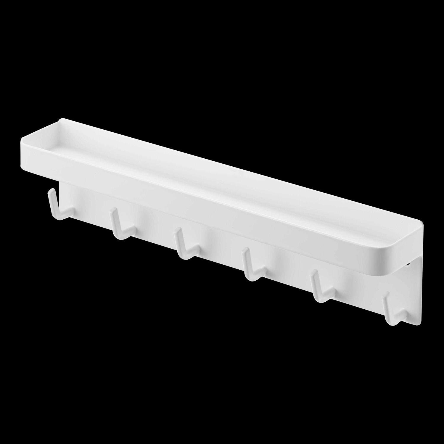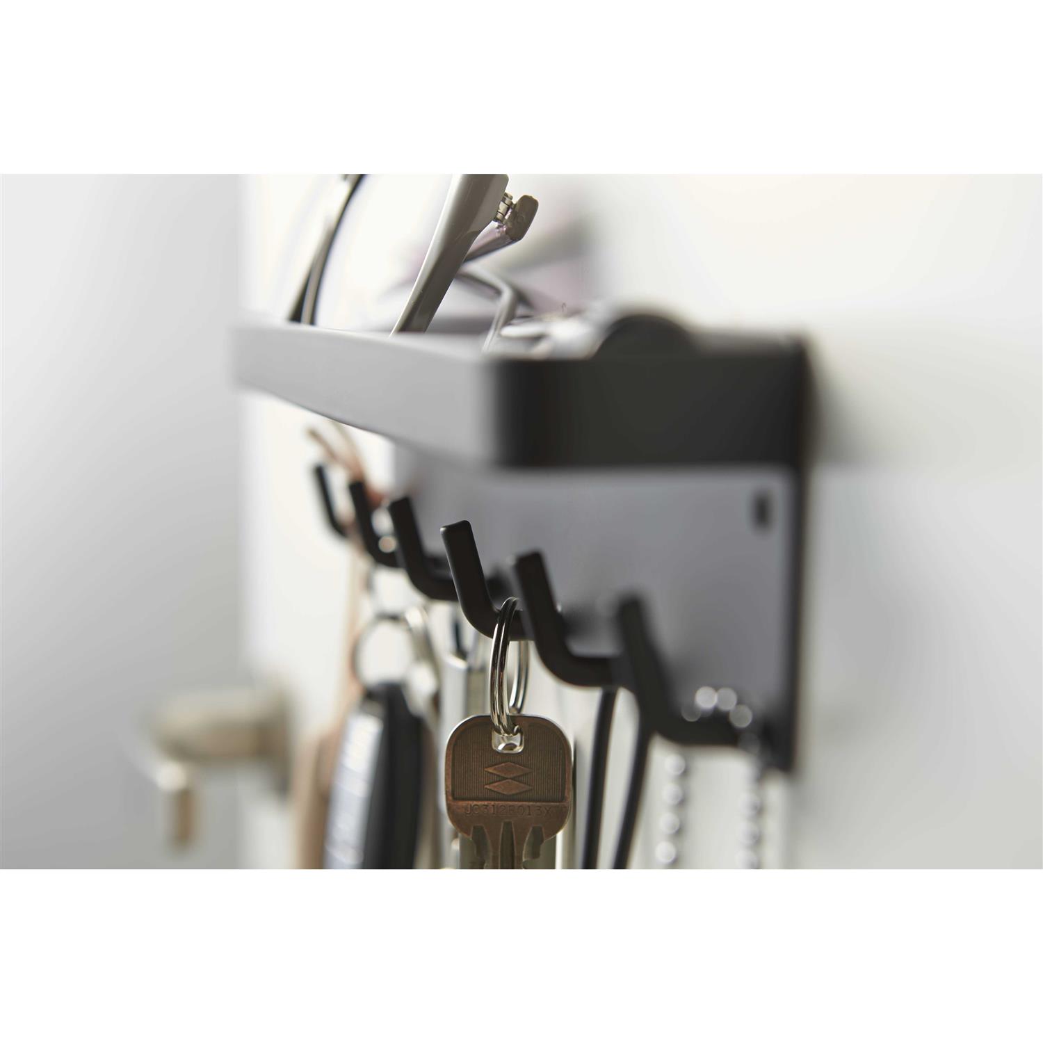 Yamazaki Smart Magnetic Key Storage Hanger with 6 Hooks and Tray in BlackYou can fix this extremely practical, neat and unobtrusive storage item magnetically to any suitable surface as it comes with a full length and width magnetised sticky pad. Simply stick the pad to any smooth, clean surface, ensure it has been firmly pressed on and secured, then attach the metal storage unit itself to the magnetised side. Quick, simple, easily removable and no drill holes to fill later or drilling dust to clean up! Do remember though sticky pads can damage surfaces such as paint etc. Alternatively you can fix to a wall, door, cupboard or other suitable surface using the 2 screws supplied. The perfect way to always know where your keys are! With 6 hooks you can not only hang car, home, office, garage and other keys but also maybe a portable umbrella, cap or similar itemsThe top tray has a ridge all the way around allowing you to store loose items or glasses, torches and other things you may need when you venture out.All Yamazaki products are compactly designed to fit in living areas where storage is limited. Always check the dimensions to ensure it fits the intended space, if in doubt please shout out!